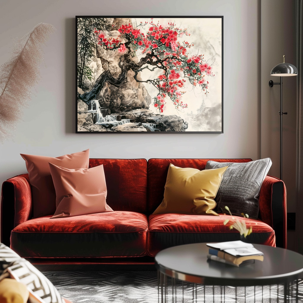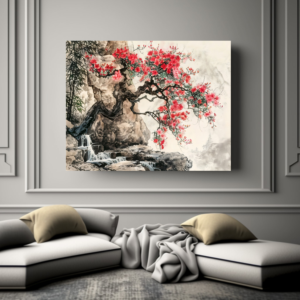 "Chinese Watercolor Blossoming Tree in Mountains" by Anja Frost