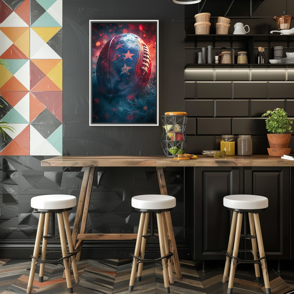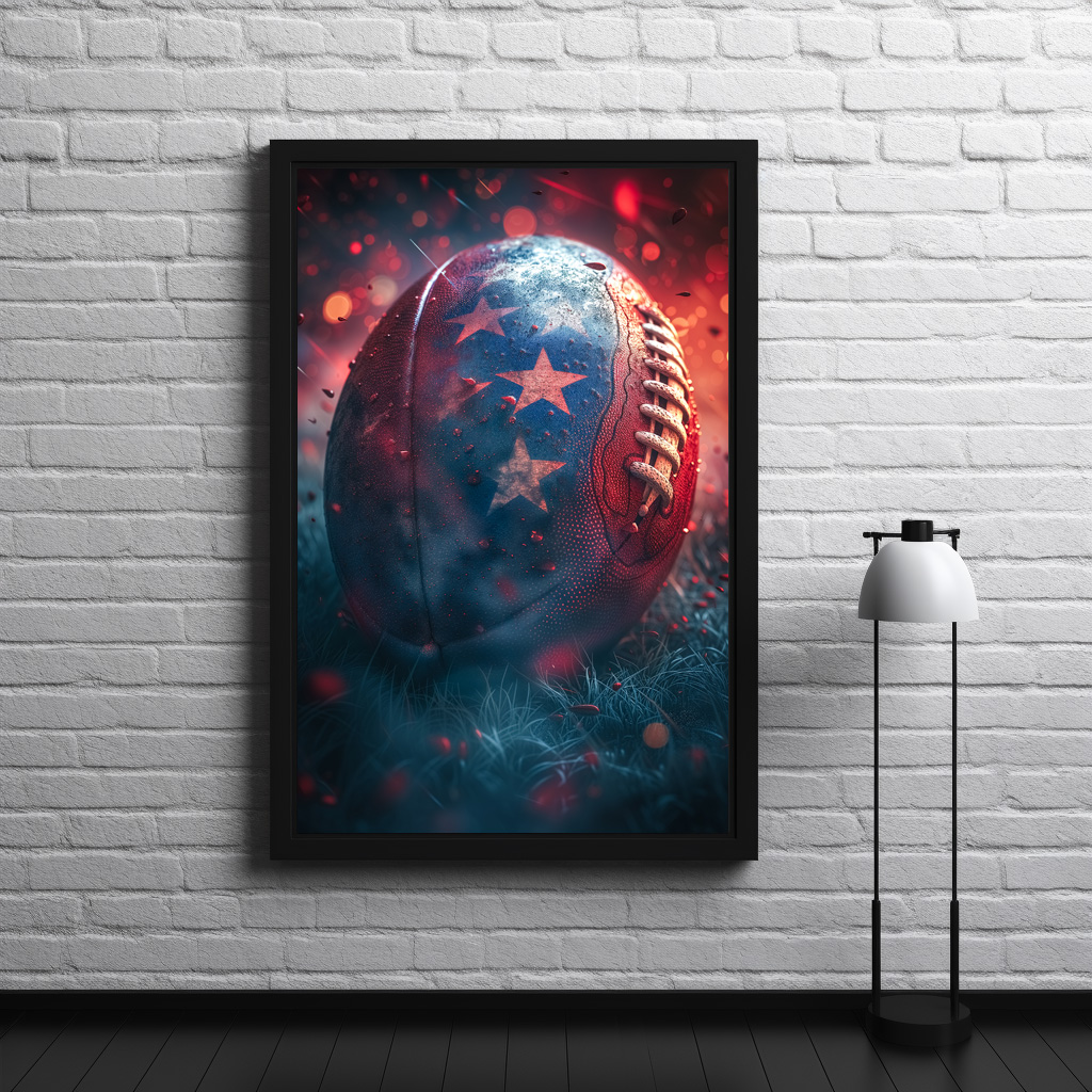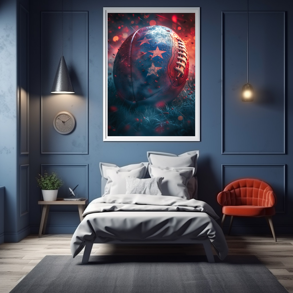 Der Football mit einem auffälligen Design, das Sterne und eine glatte, leicht nasse Oberfläche zeigt. Die Atmosphäre wirkt mystisch und dynamisch.