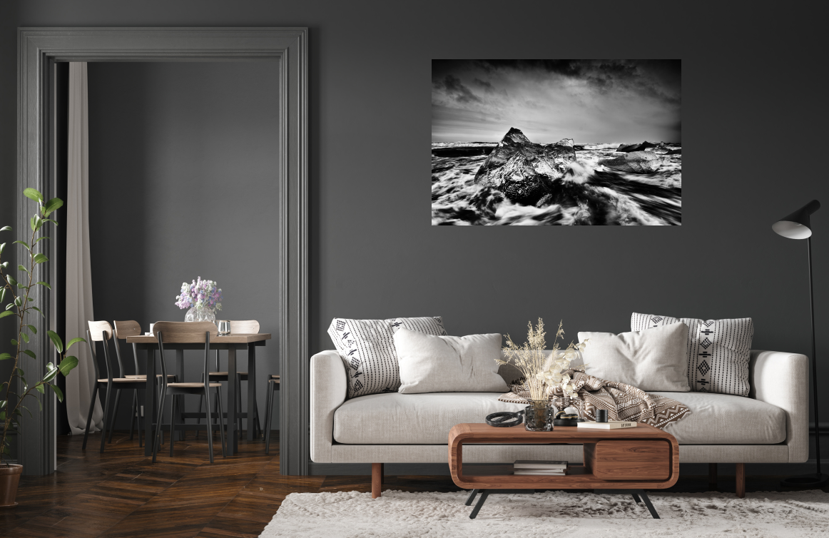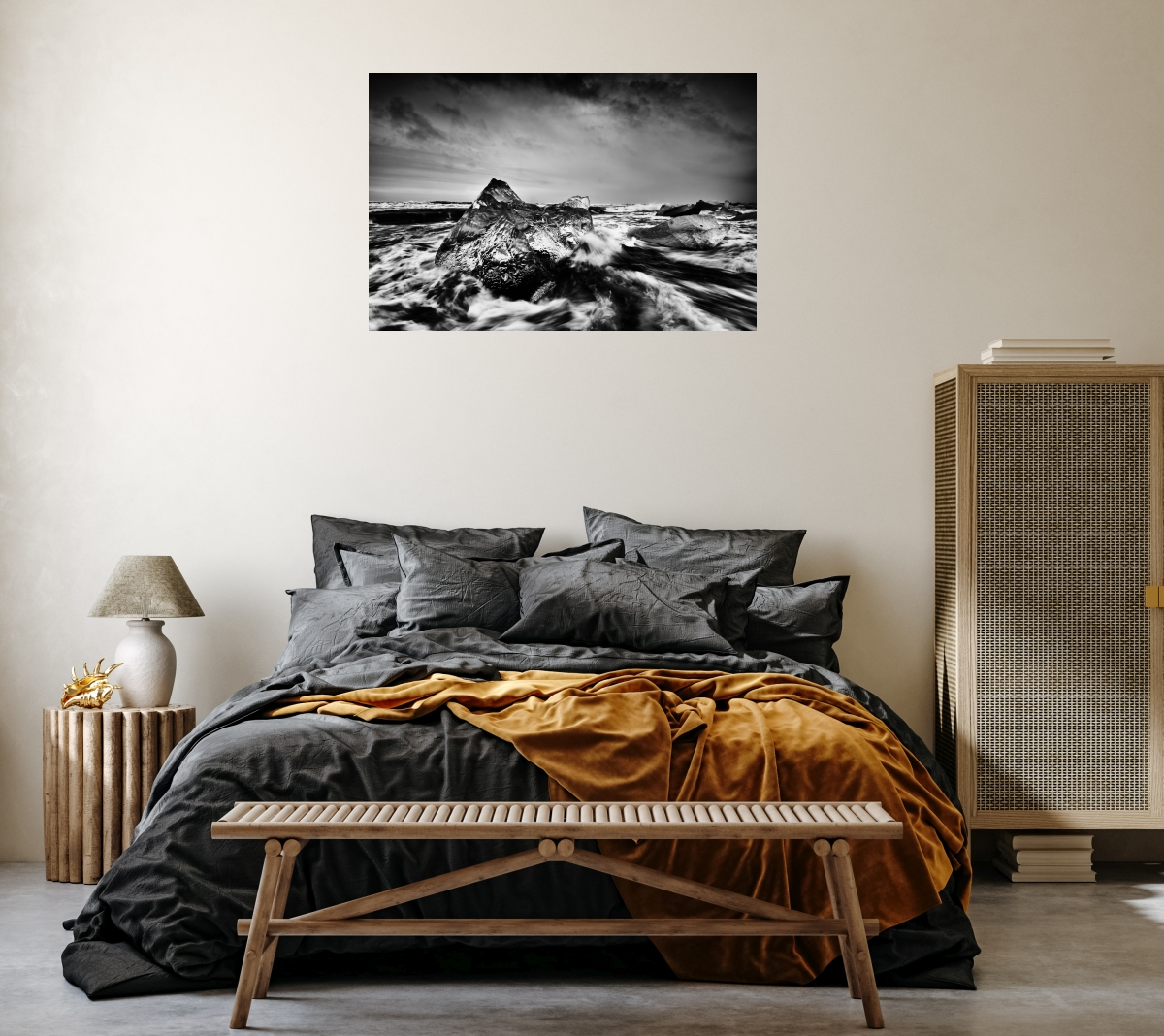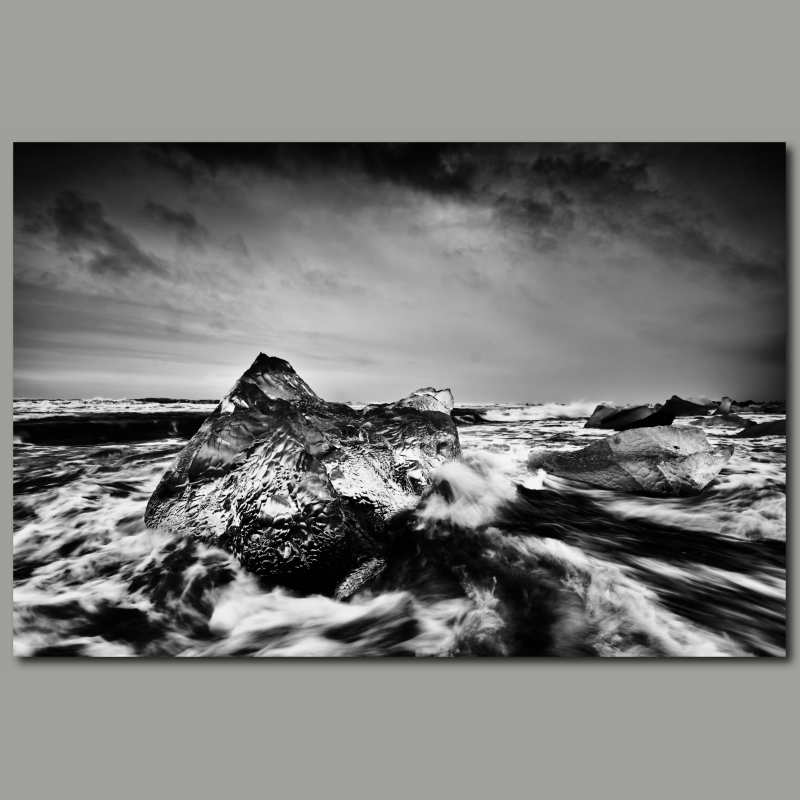 Schwarzweißbild eines markanten Eisblocks an einem schwarzen Strand mit starker Brandung, Bewegungsspuren des Wassers auf dem dunklen Sand, im Hintergrund weitere Eisblöcke, Wellen rollen heran, kontrastreicher Himmel – Location: Island, Jökulsarlon (Jökulsárlón)