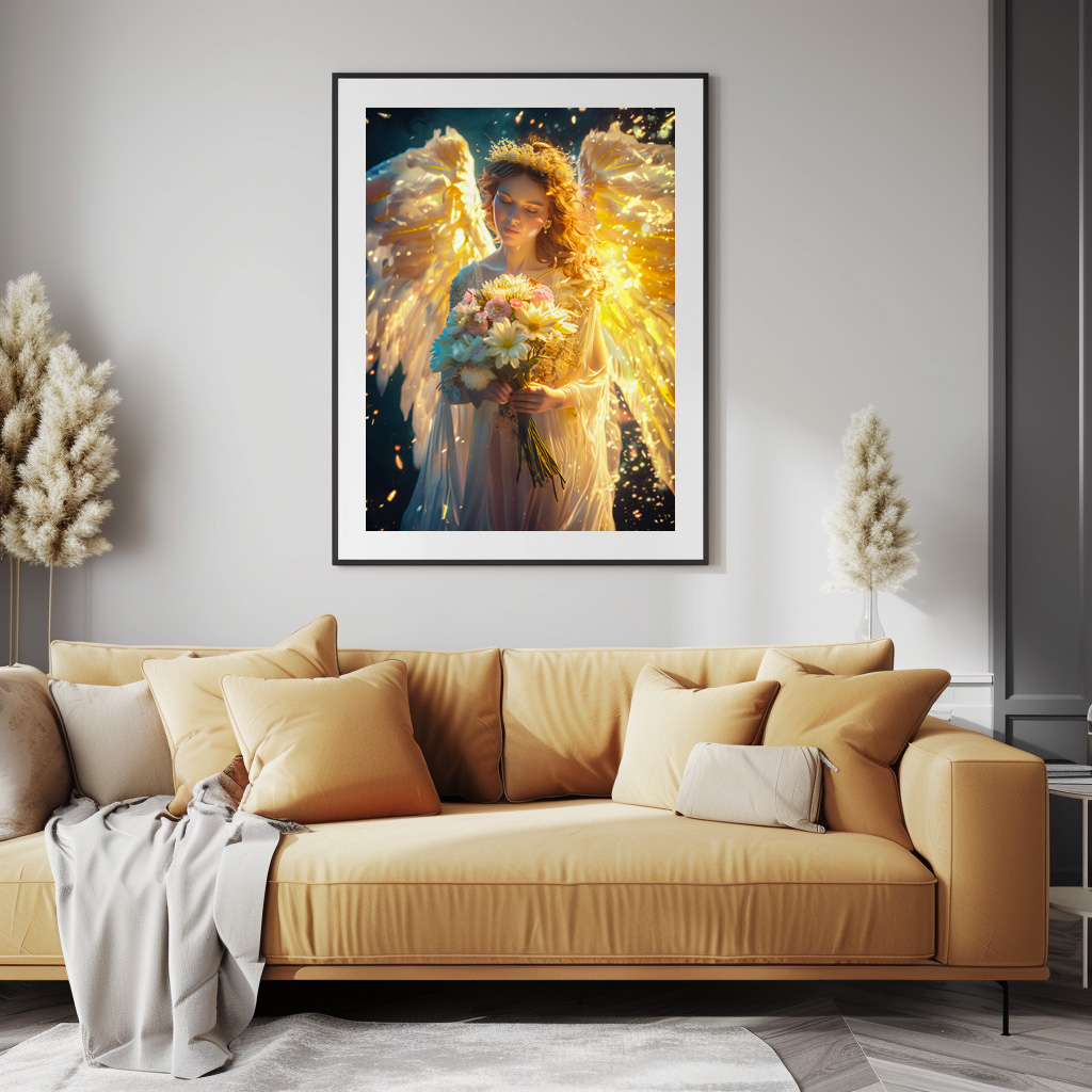 illustration capturing an angelic figure delicately holding a bouquet of flowers, radiating a sense of celestial elegance and purity. Witness the ethereal beauty of this heavenly messenger adorned with natures bounty