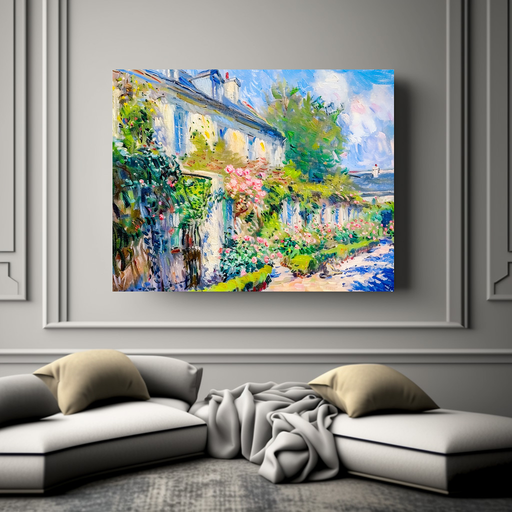 Romantic roses climbing along a sunlit house wall, painted in impressionist style with warm summer tones and soft textures.