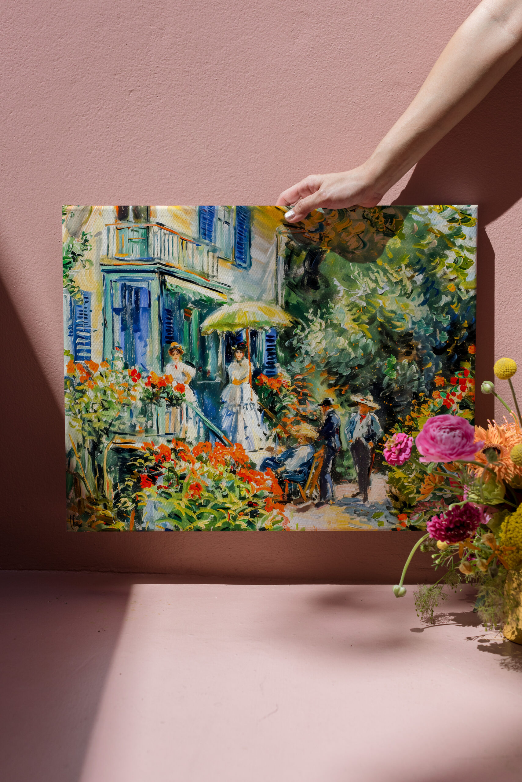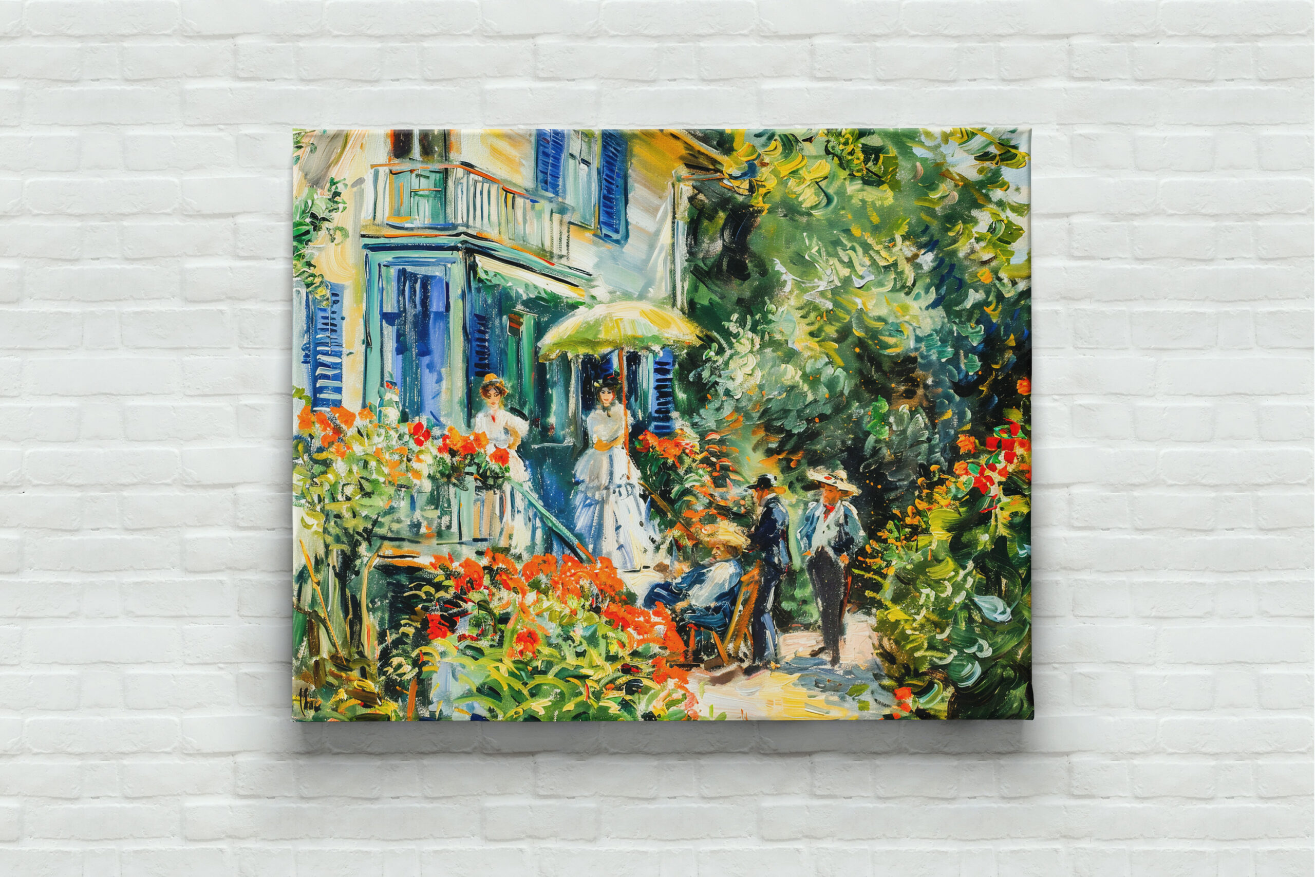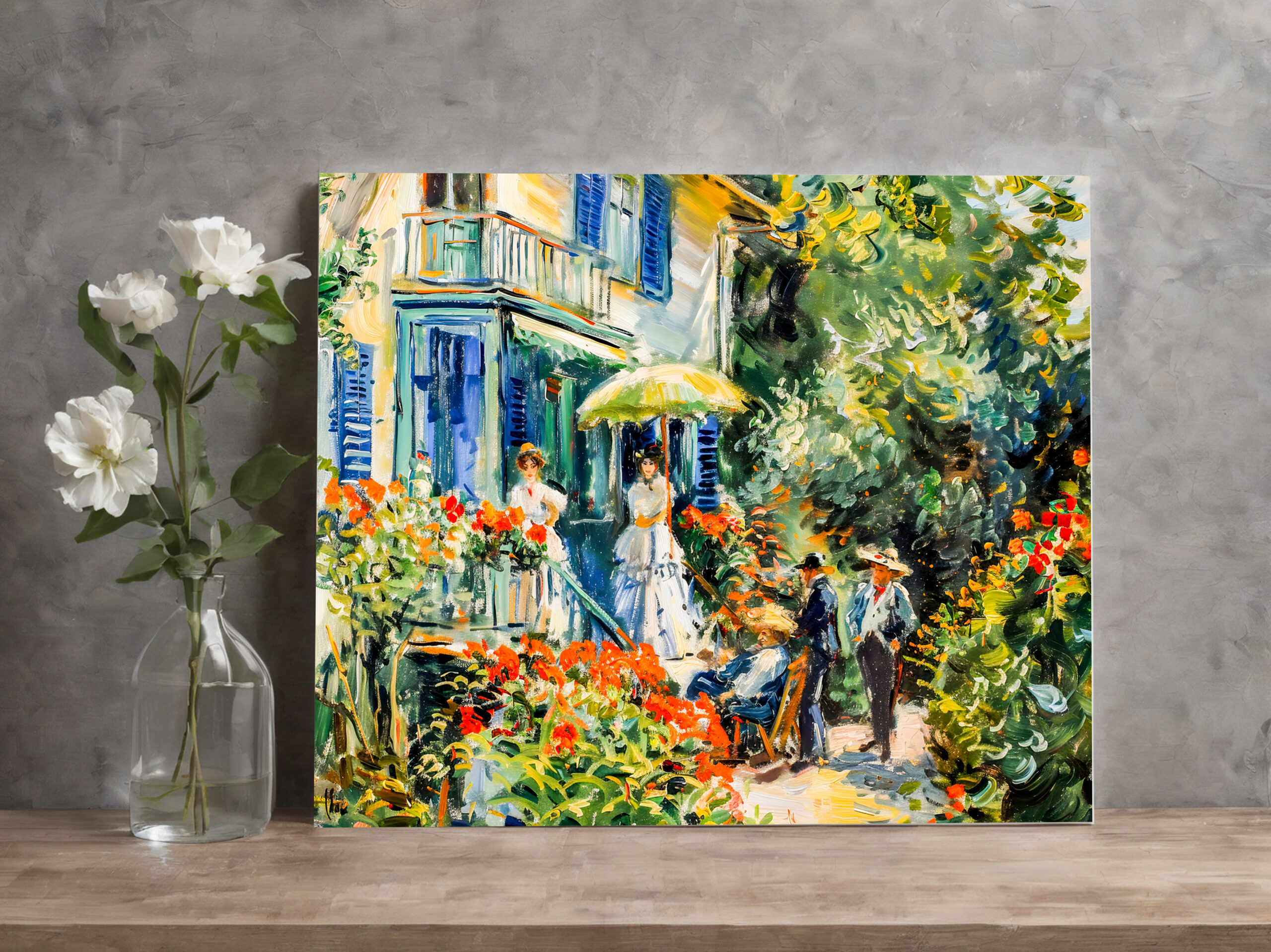 Impressionist painting of a group gathered in a lush garden in front of a villa, enjoying leisure and beauty of nature.