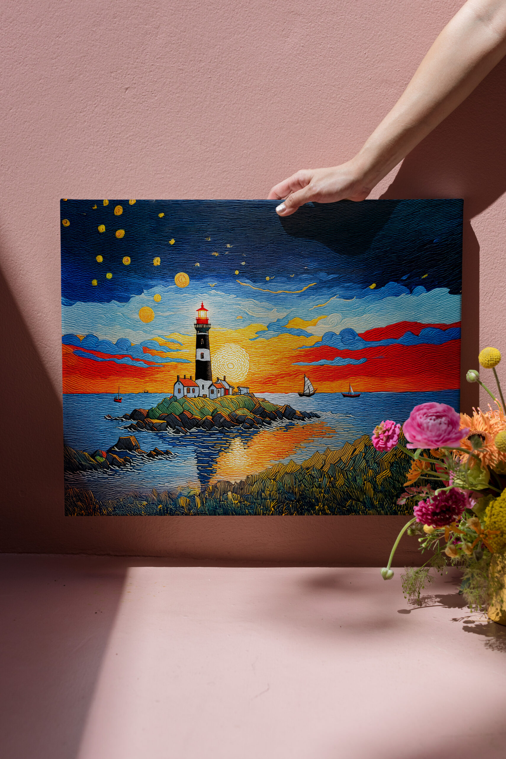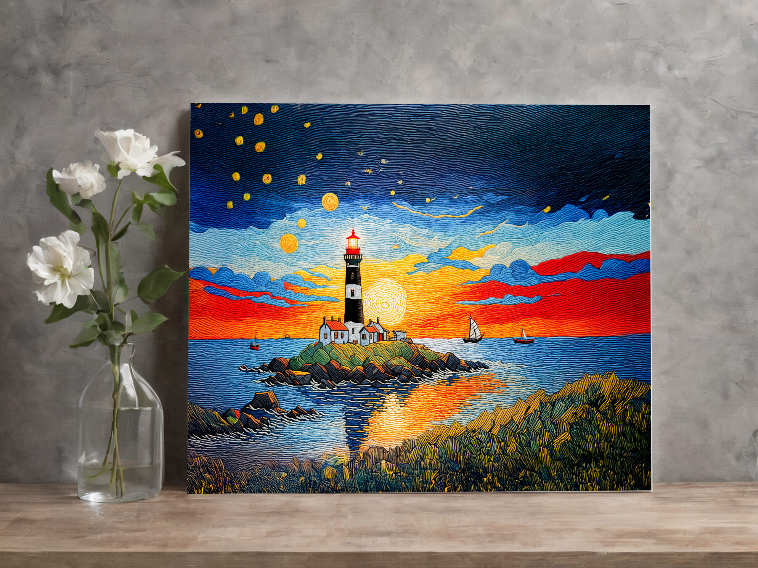 A solitary lighthouse standing tall against a stormy sea, symbolizing guidance and resilience. Perfect for dramatic and inspiring decor.