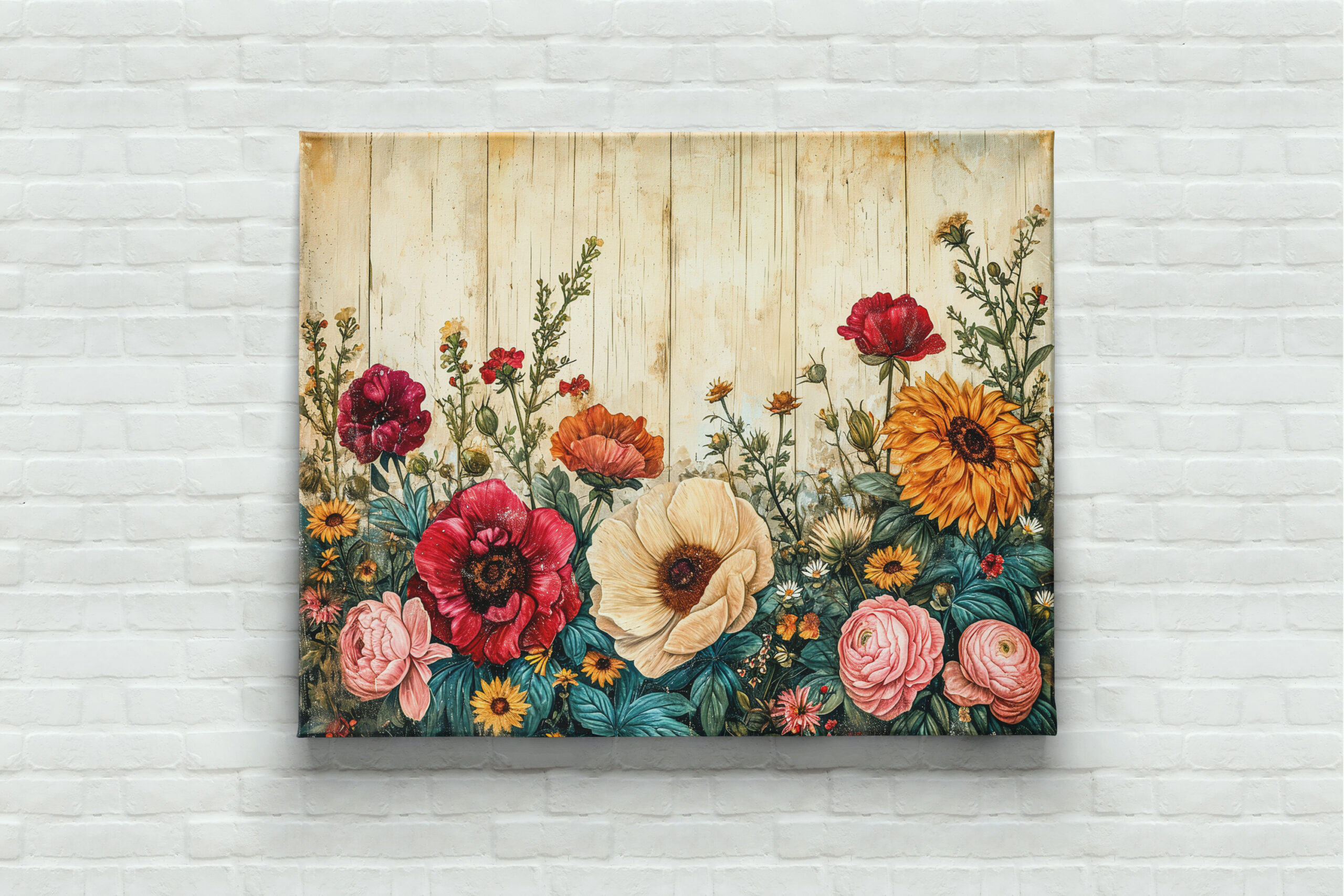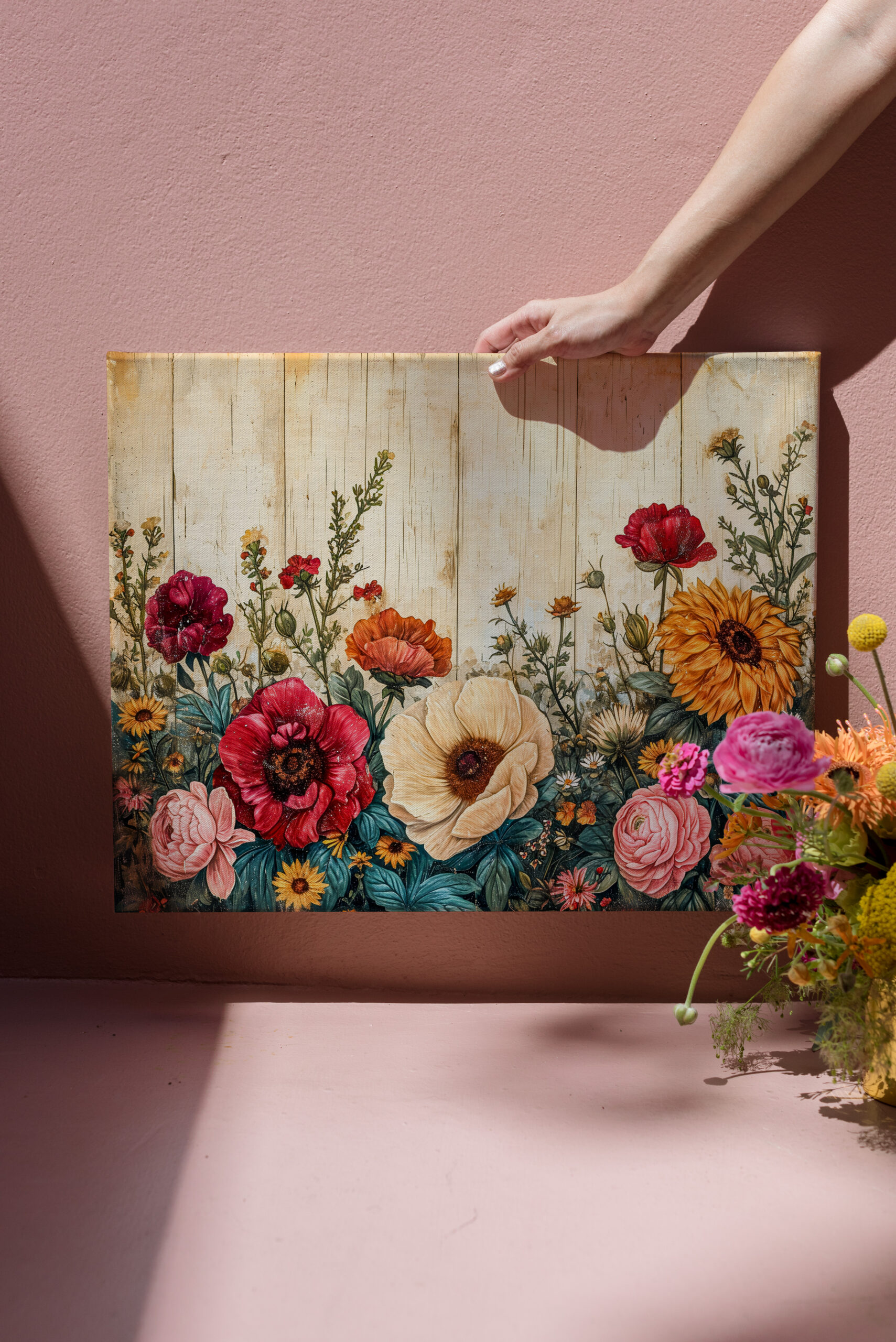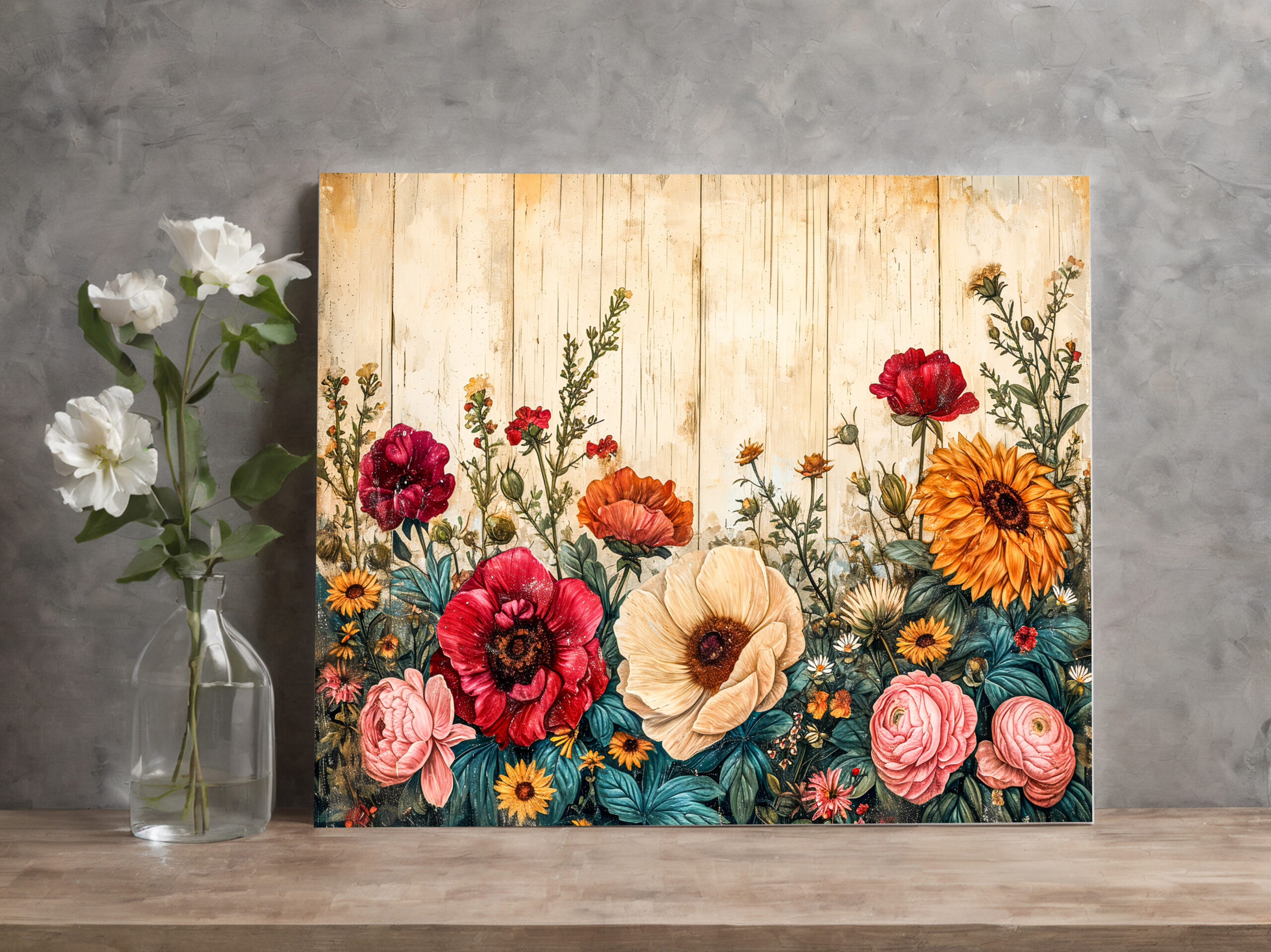 bright arrangement of sunflowers, pink roses, and red wildflowers on a distressed white wooden backdrop. A warm and inviting floral design full of countryside charm.