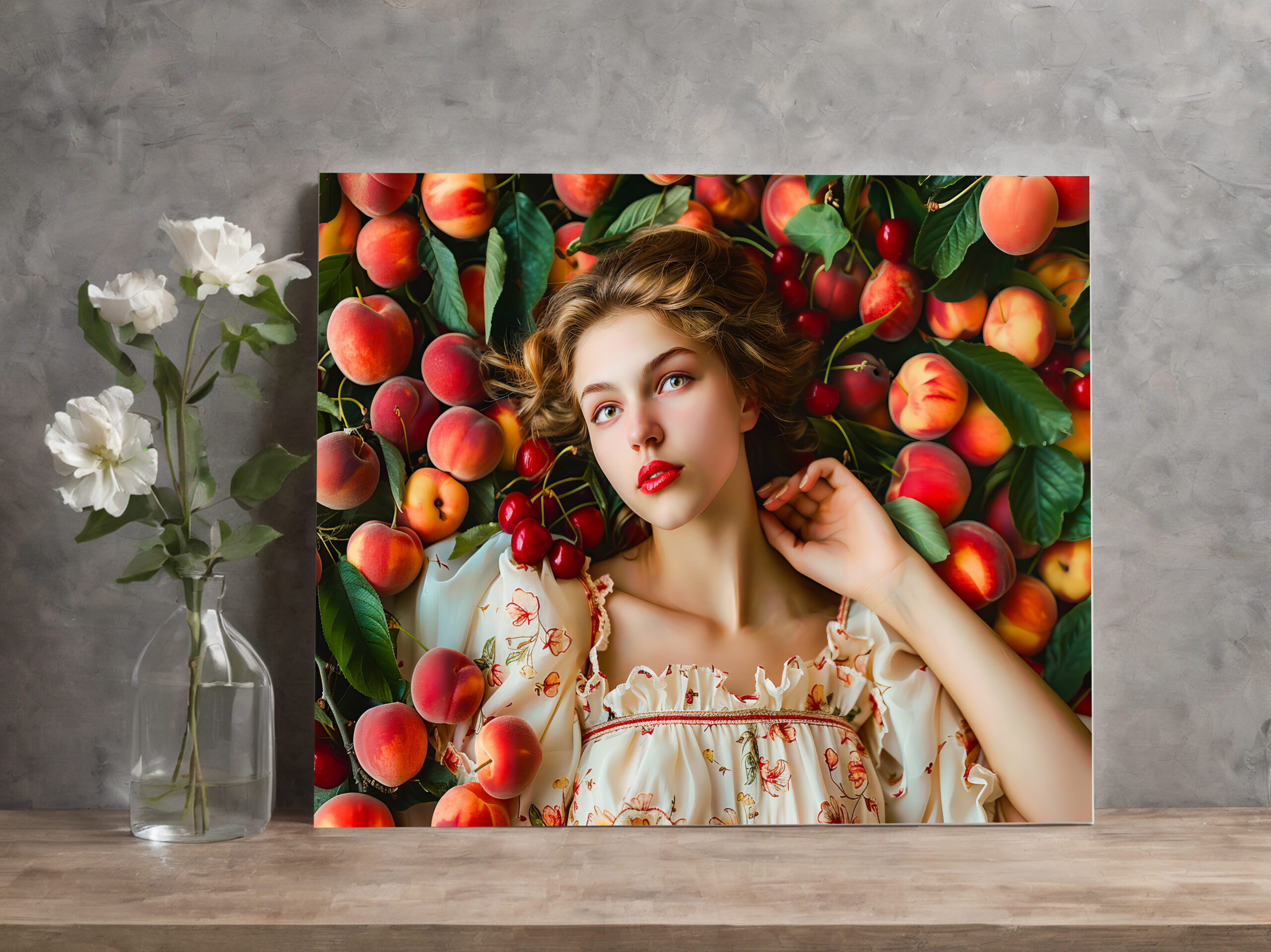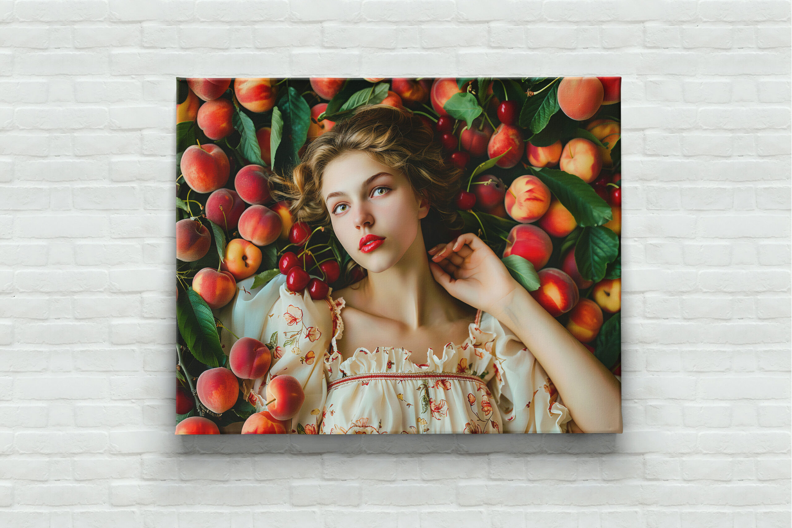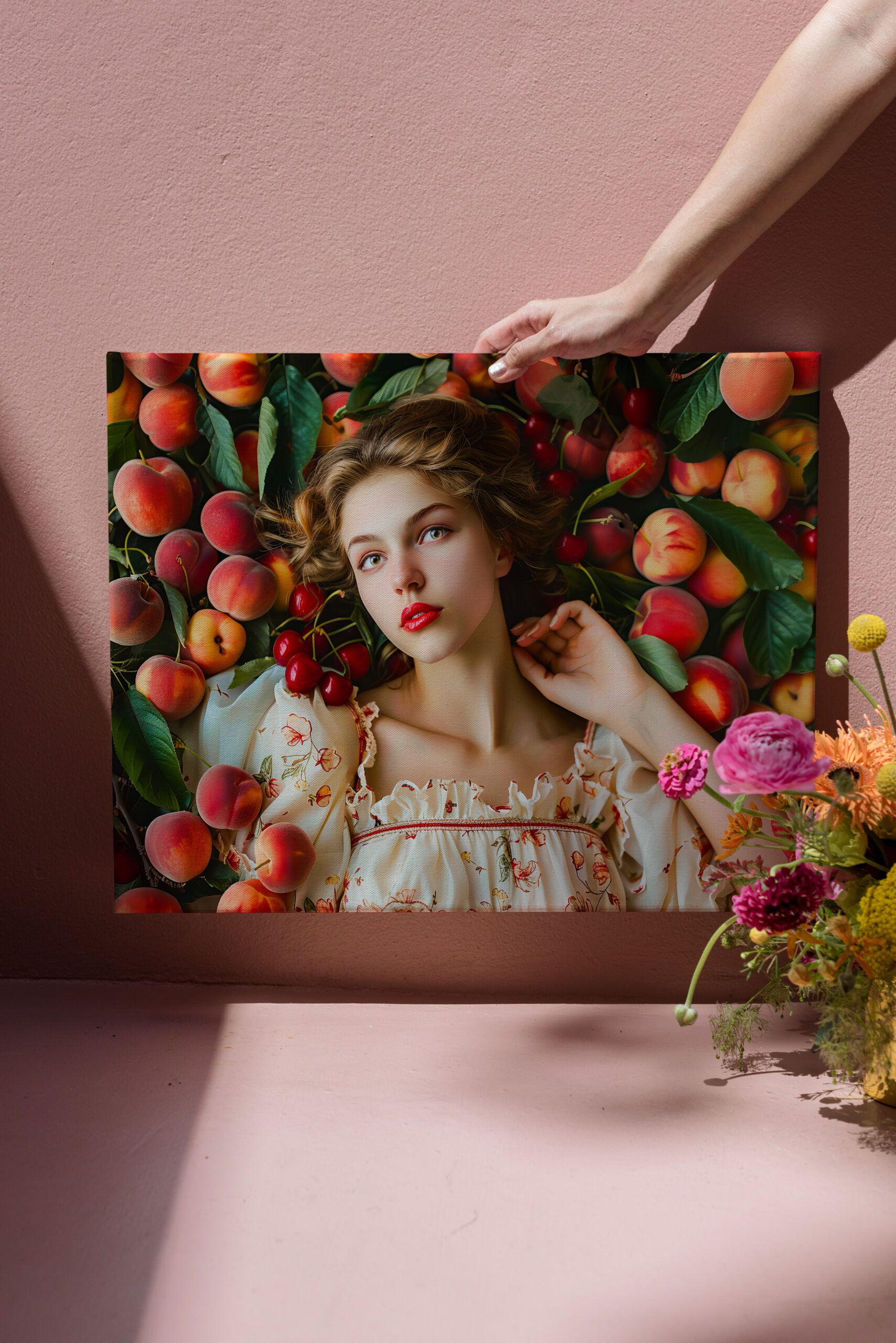 A woman poses with peaches and cherries in a soft, painterly portrait. The scene captures warmth, elegance, and natural beauty.