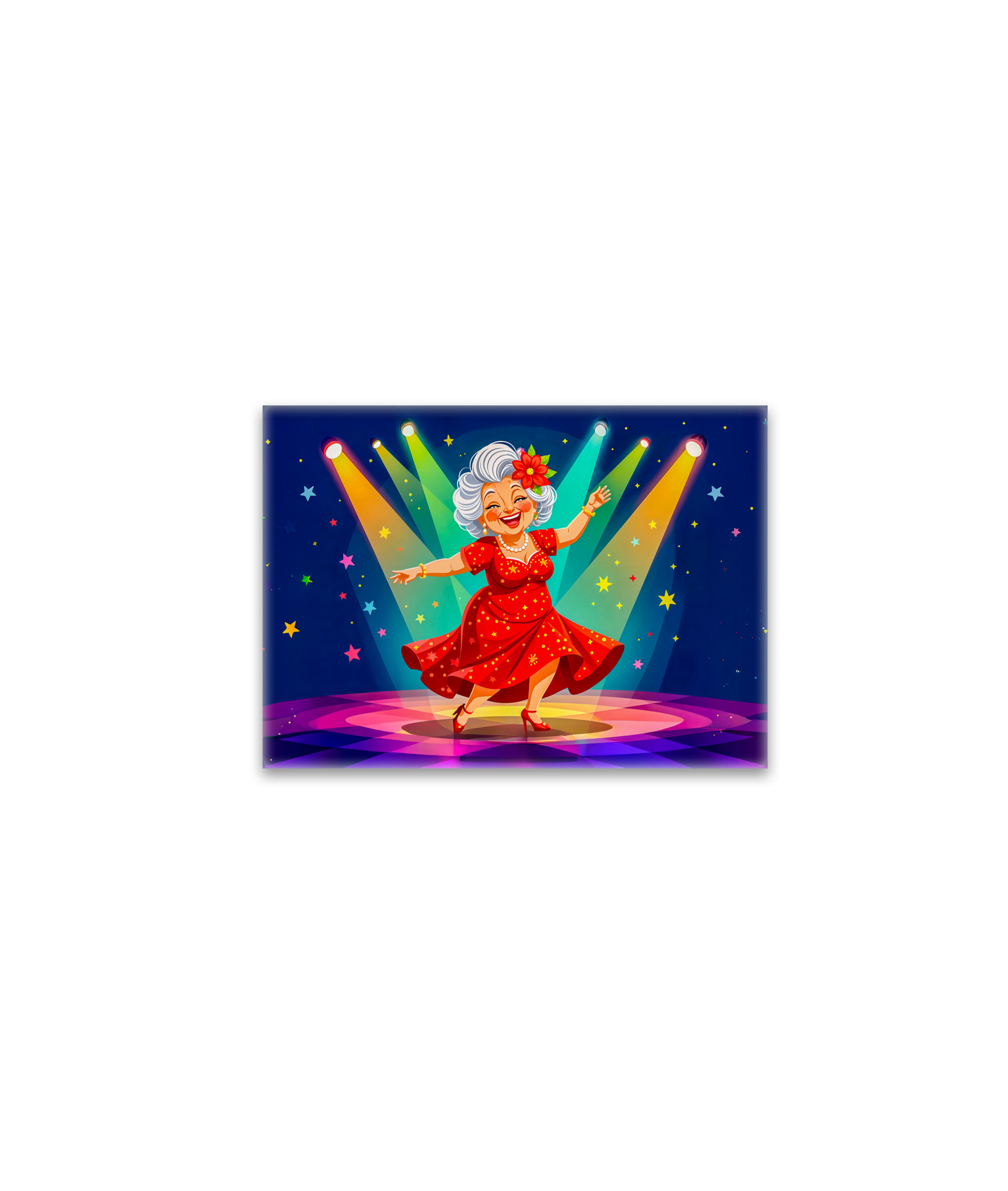 Funny grandmother in a red dress dancing joyfully on stage with bright lights and confetti. Humorous, colorful illustration of retirement, music, fun and senior lifestyle with humor and charm.