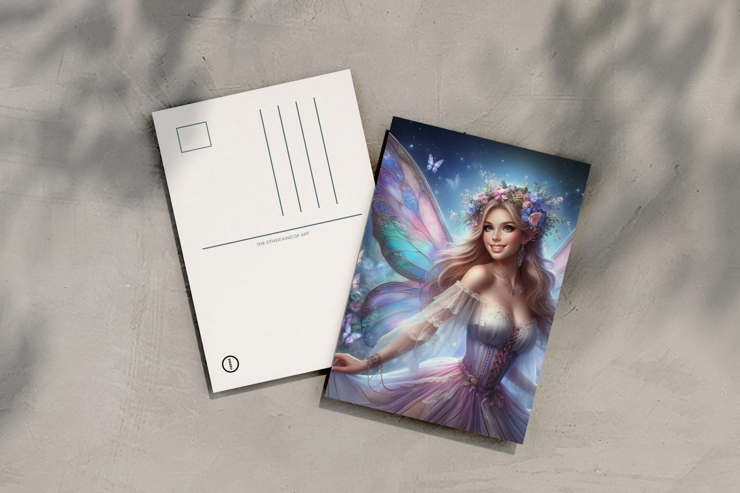 Das Bild Marielle zeigt eine blonde Fee mit einem strahlenden Lächeln in einem schimmernden, eleganten Kleid. Vor einem blauen Hintergrund tanzen bunte Schmetterlinge um sie herum. Ihre Augen leuchten voller Freude, während ihr Haar sanft im Wind weht, was eine magische, fröhliche Atmosphäre schafft.