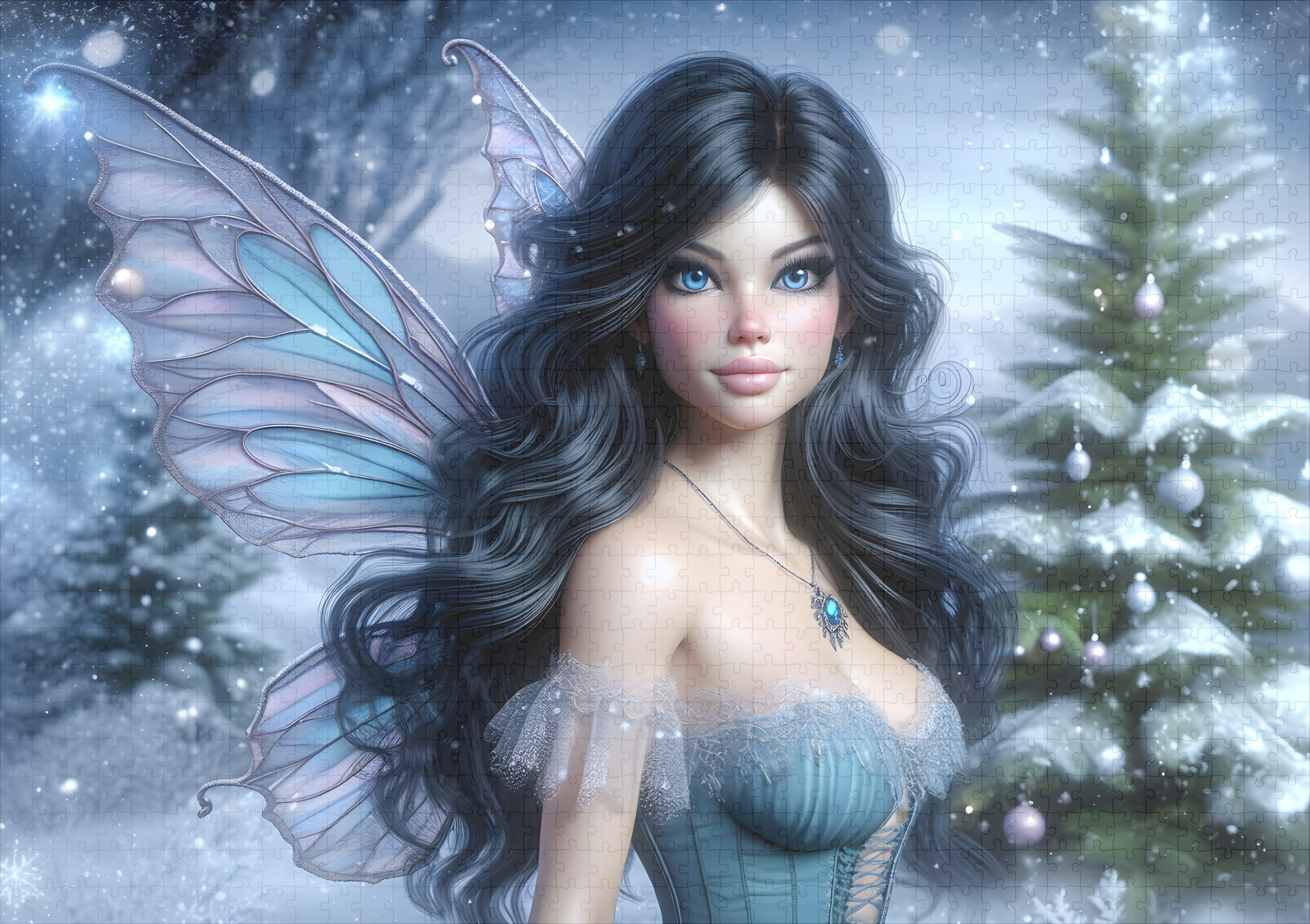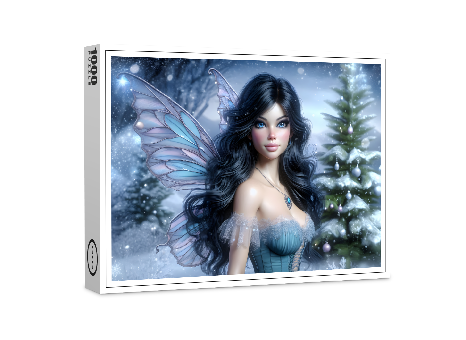 Eine Fee mit langen, schwarzen Haaren steht im verschneiten Winterwald, umgeben von schneebedeckten Tannen. Sie trägt ein elegantes blaues Kleid, das perfekt zur winterlichen Szenerie passt. Ihre Flügel schimmern in zartem Grau-Blau und reflektieren das kühle Licht der Schneelandschaft. Sanft fallende Schneeflocken tanzen in der Luft und verleihen der Szene eine magische, ruhige Atmosphäre, voller winterlicher Schönheit und Frieden.