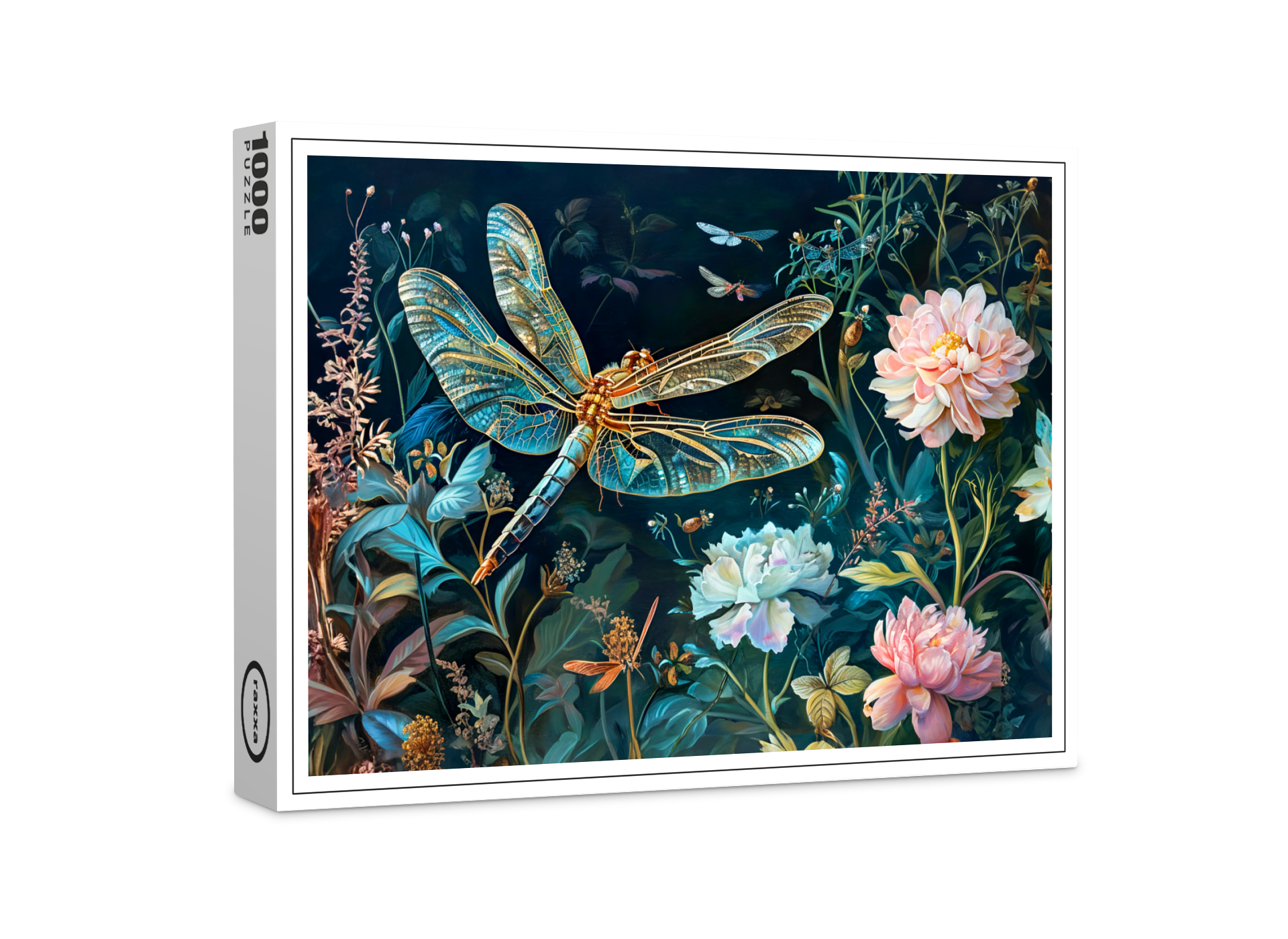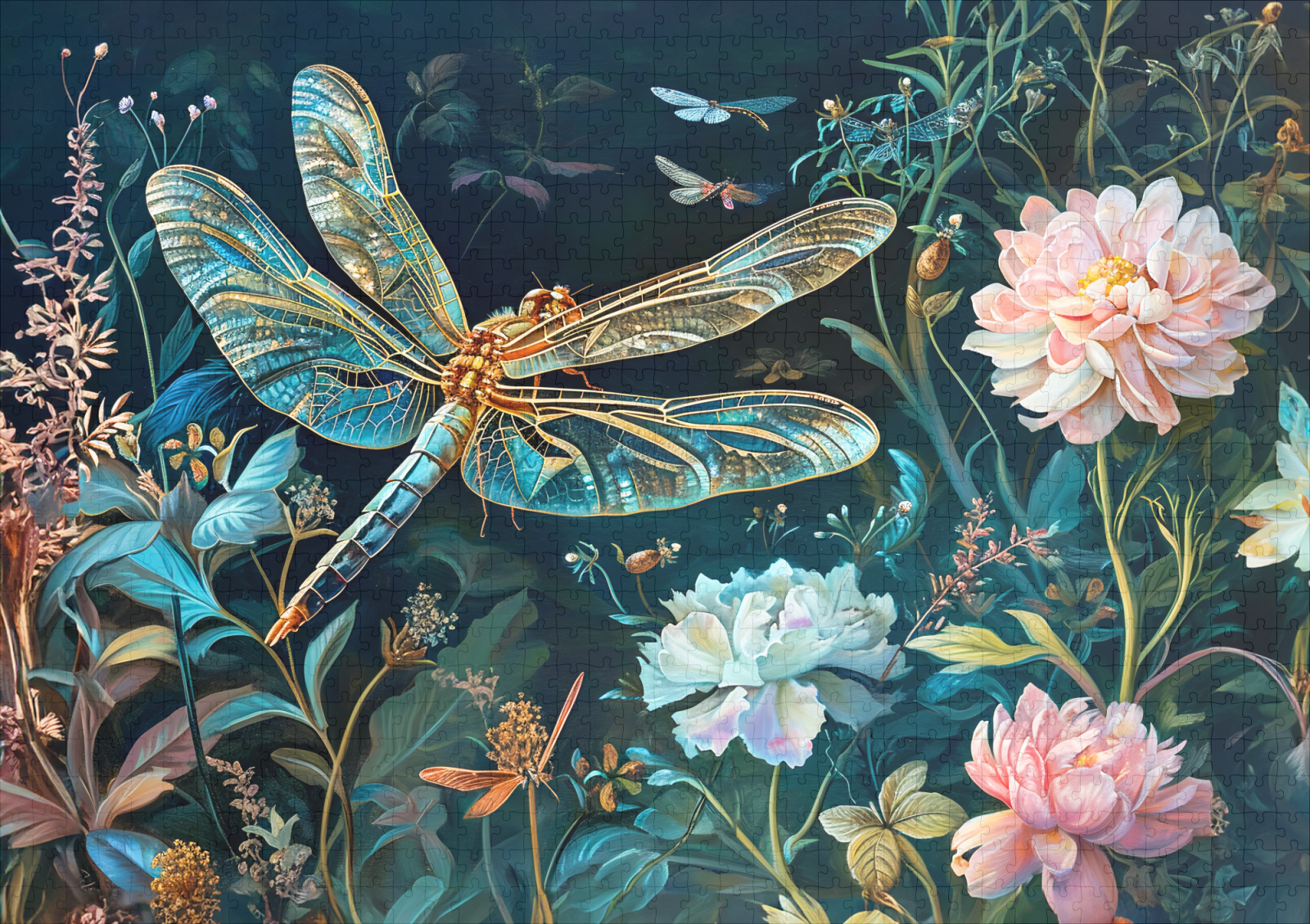 raxxa Premium-Puzzle: Dragonfly at Night in a Garden with Peonies and Grasses Illustration