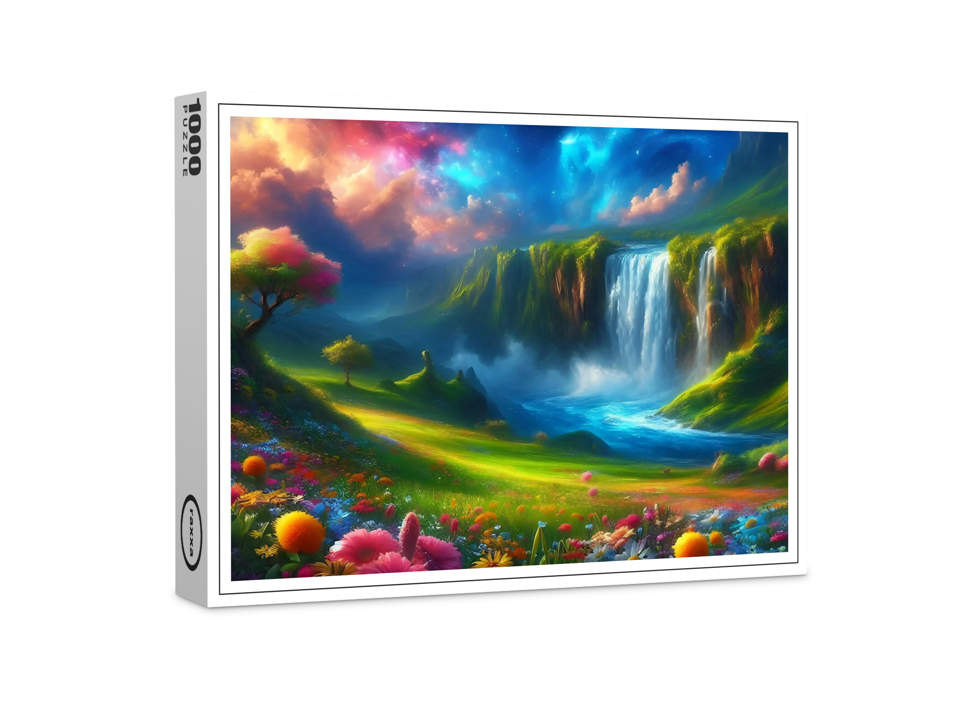 Eine strahlend grüne Wiese voller bunter Blumen, eingerahmt von einem majestätischen Berg mit einem Wasserfall, der in einen sanften Fluss mündet. Am Himmel leuchtet ein galaktischer Nebel in schimmernden Farben, während die Sonne die Wiese mit warmem Licht erfüllt und eine magische Atmosphäre schafft.