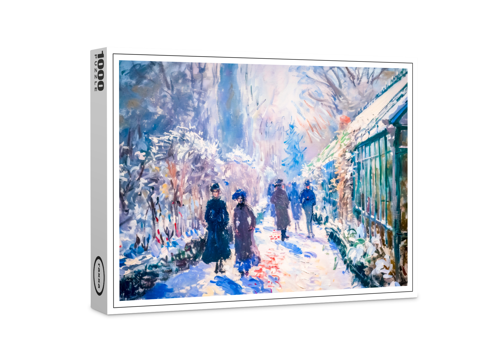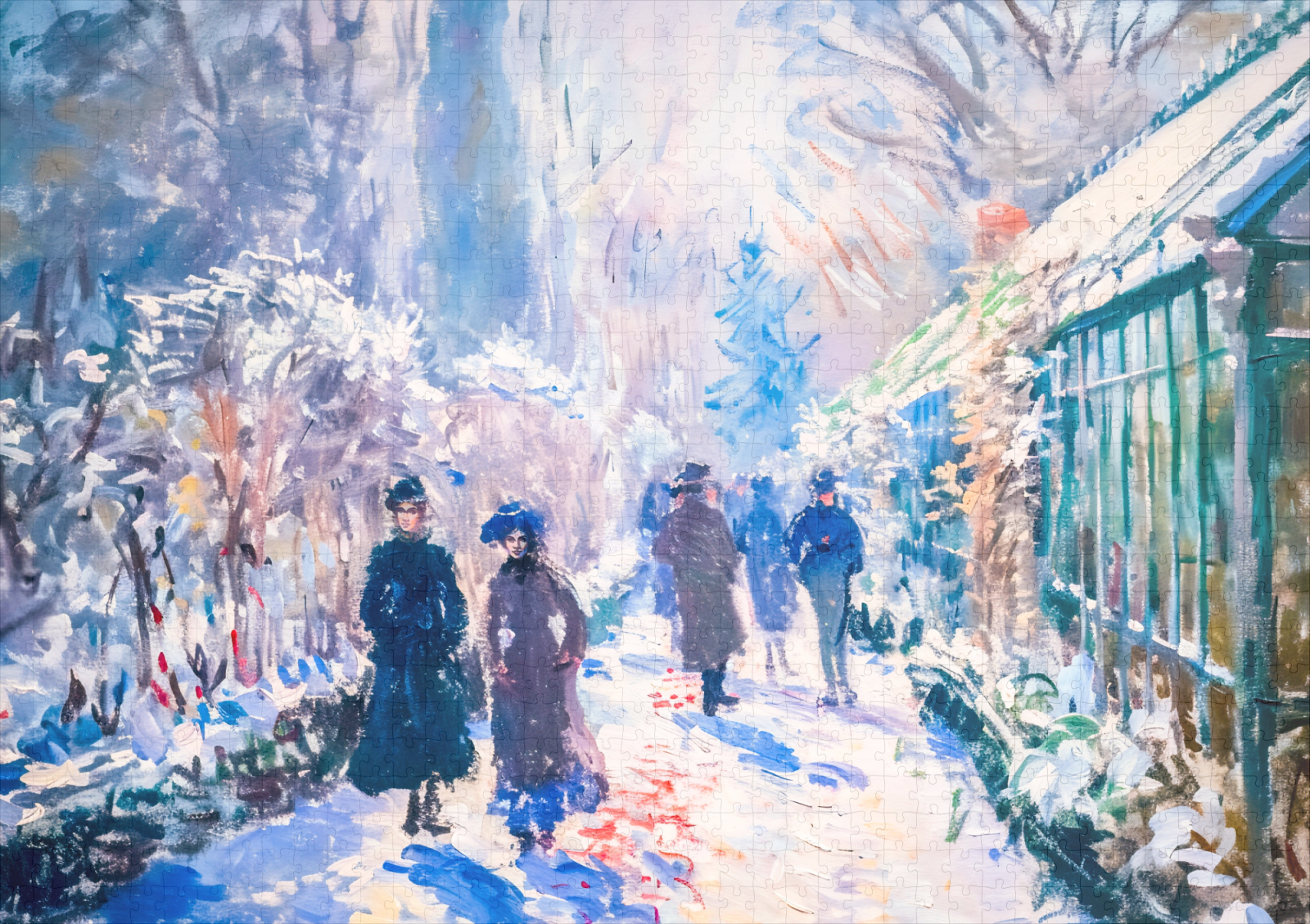 Romantic garden scene painted in an impressionist style, showing snow-covered paths and people strolling through the soft winter light.