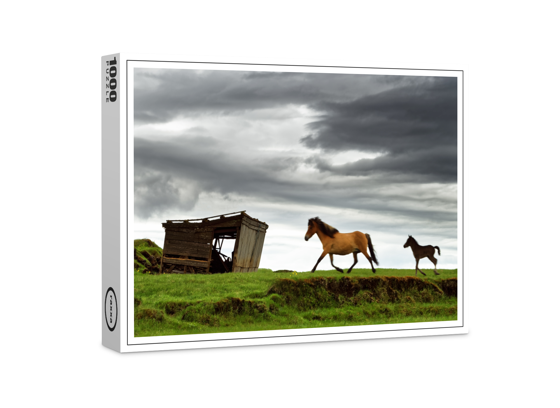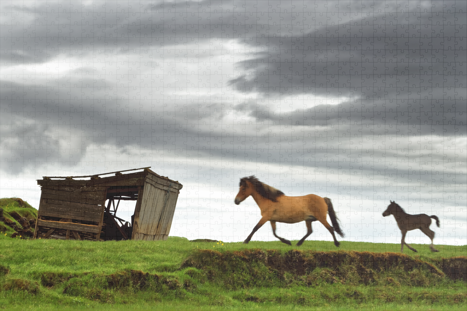 Zwei Islandpferde laufen über eine Wiese zu einer Holzhütte, eines der Tiere ist ein Fohlen, darüber ein dramatisch bewölkter Himmel, ein landestypisches Motiv – Location: Island, Golden Circle