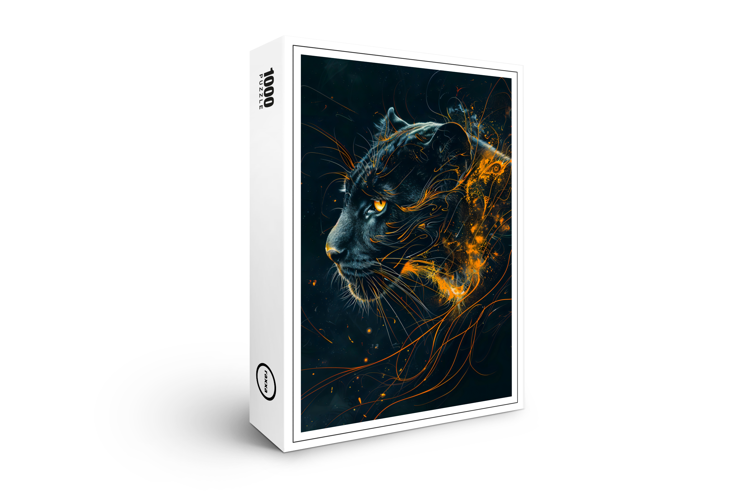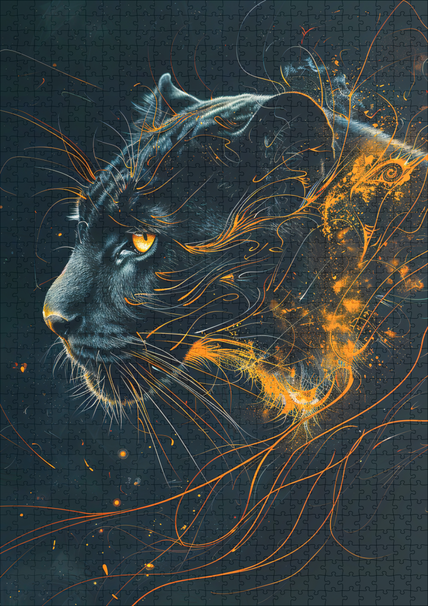 black panther illuminated by orange neon light trails, creating a cosmic and mesmerizing effect.