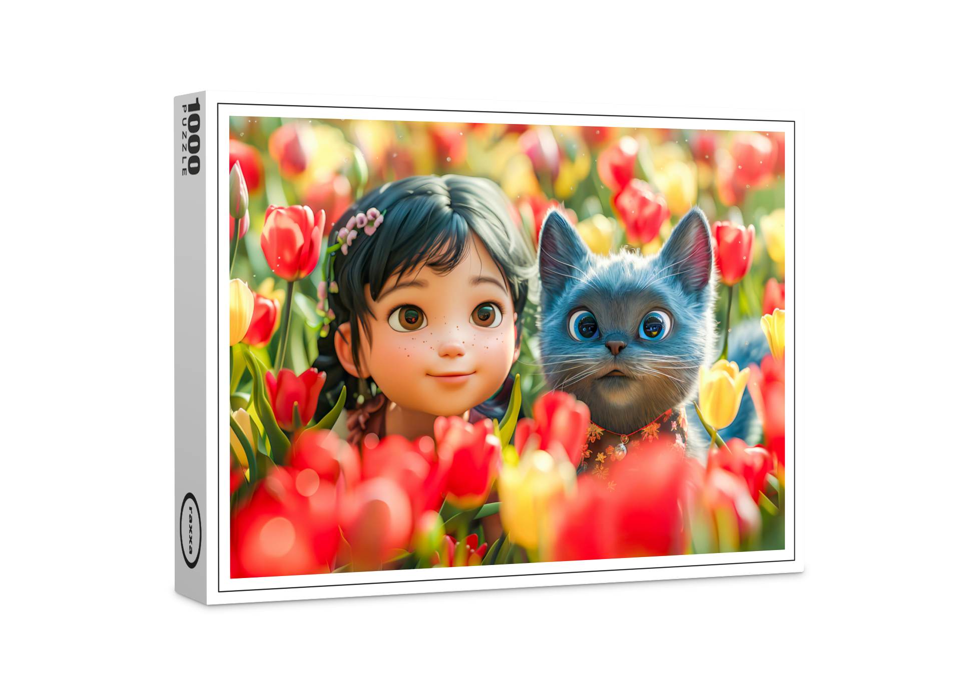 In a colorful tulip field, a fantasy girl and her big-eyed cat enjoy a magical spring day. Whimsical and cheerful.