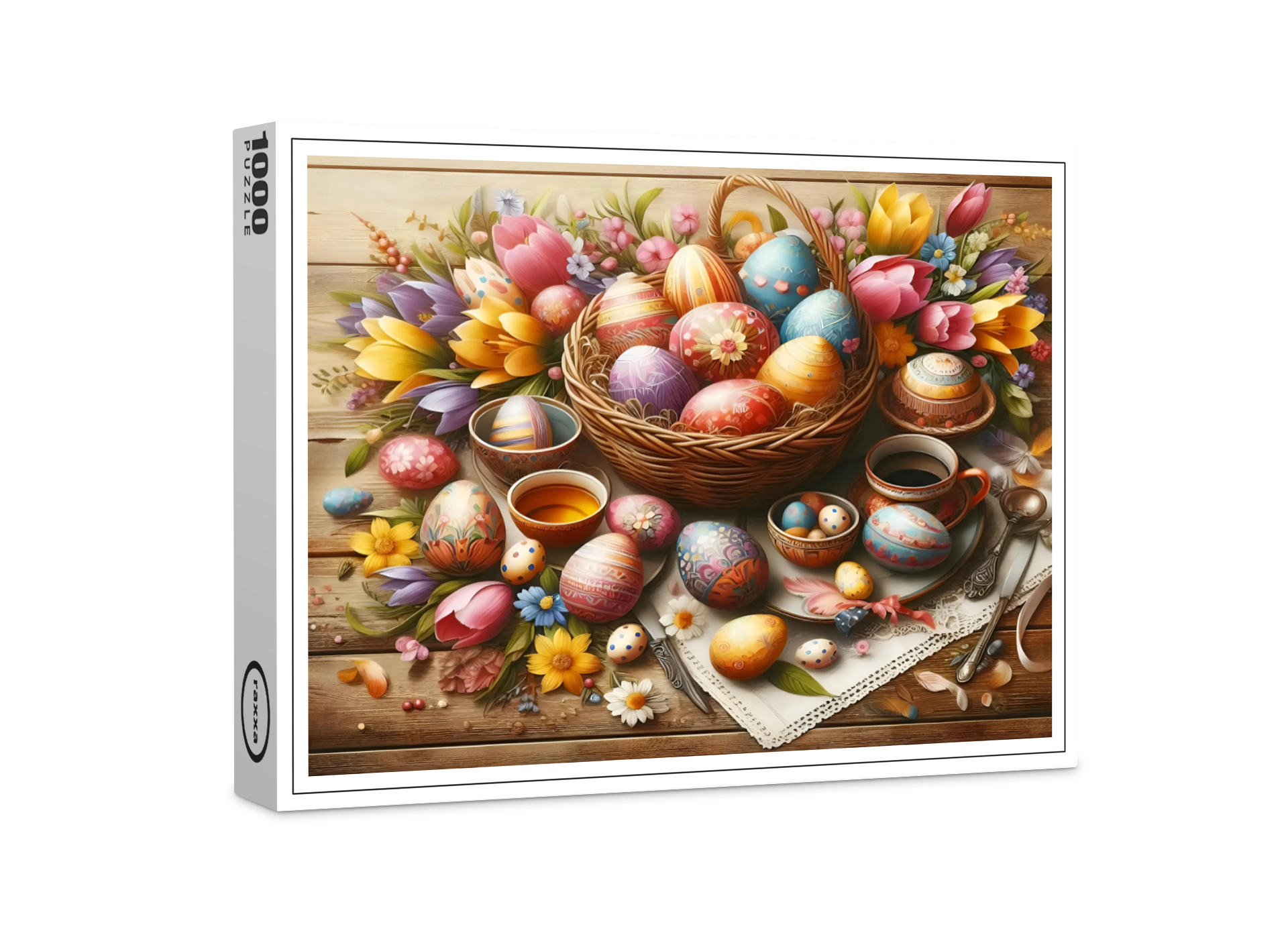 Auf dem Tisch steht ein stilvoller Platzhalter, geschmückt mit bunten Ostereiern und fröhlichen Ostermotiven. Die lebendigen Farben verleihen der Szene eine festliche Atmosphäre, während das kunstvolle Arrangement die Vorfreude auf das Osterfest weckt.