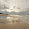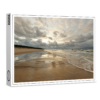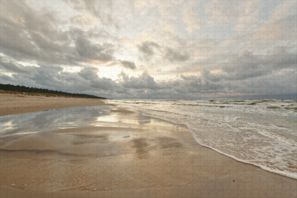 Weiter Blick über einen menschenleeren Strandabschnitt, im Vordergrund Flachwasserflächen mit Blickführung zum Horizont, darüber teilweise dramatische Wolken, die einen Wetterwechsel ankündigen – Location: Polnische Ostseeküste, Slowinski Park Narodowy (Slowinzischer Nationalpark)