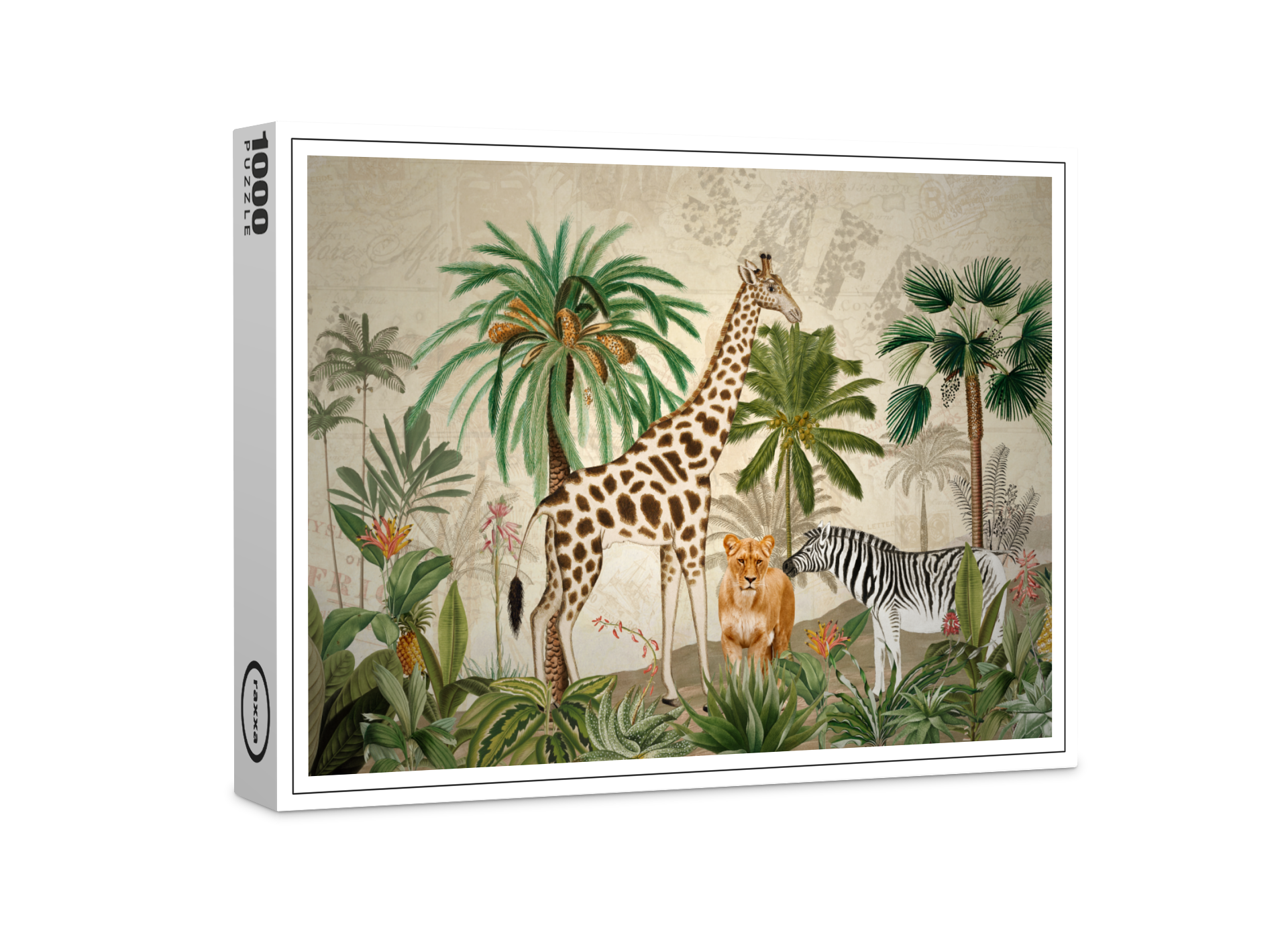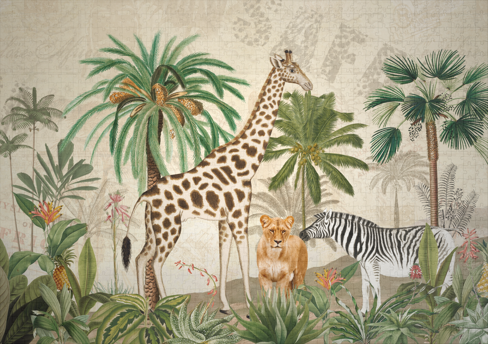 In dieser Vintage-Illustration stehen exotische afrikanische Tiere im Mittelpunkt und sind von majestätischen Palmen umgeben. Der Hintergrund ist in einem warmen Sepia-Ton gehalten, der eine nostalgische Atmosphäre schafft. Die Szene strahlt eine exotische Stimmung aus, die den Betrachter in ferne Welten entführt. Die luxuriöse Darstellung der Tiere und Palmen verleiht dem Bild eine elegante Note, die den Zeitgeist vergangener Epochen einfängt und einen Hauch von Trend und Raffinesse vermittelt. Diese Illustration fängt die zeitlose Schönheit und das faszinierende Flair der afrikanischen Tierwelt in einem stilvollen Kunstwerk ein.
