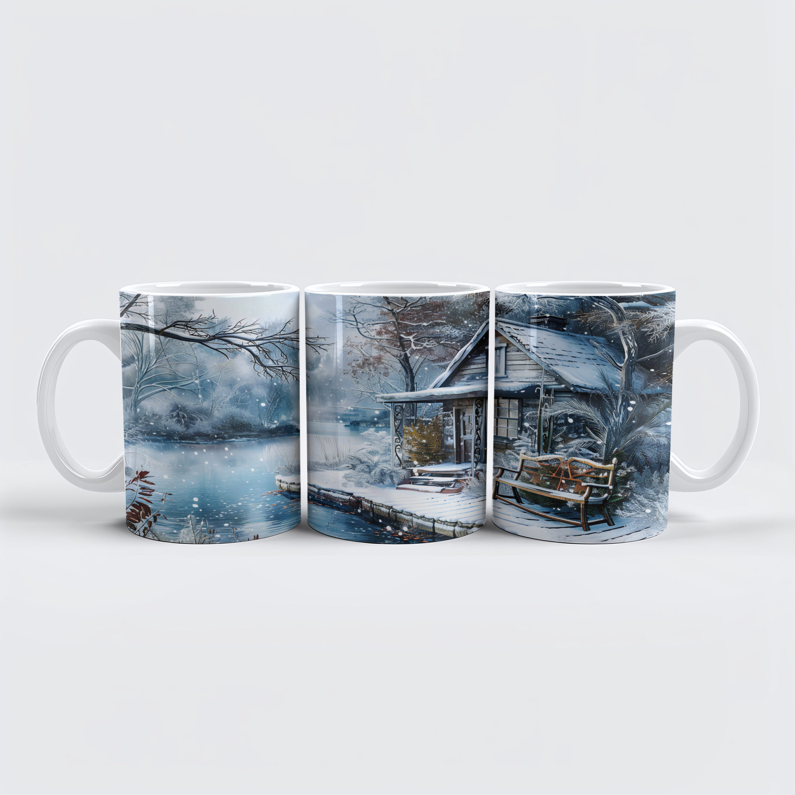 Beautiful winter illustration of an old mill by a frosty river, surrounded by icy trees and a tranquil snowy landscape. Perfect for winter-themed designs.