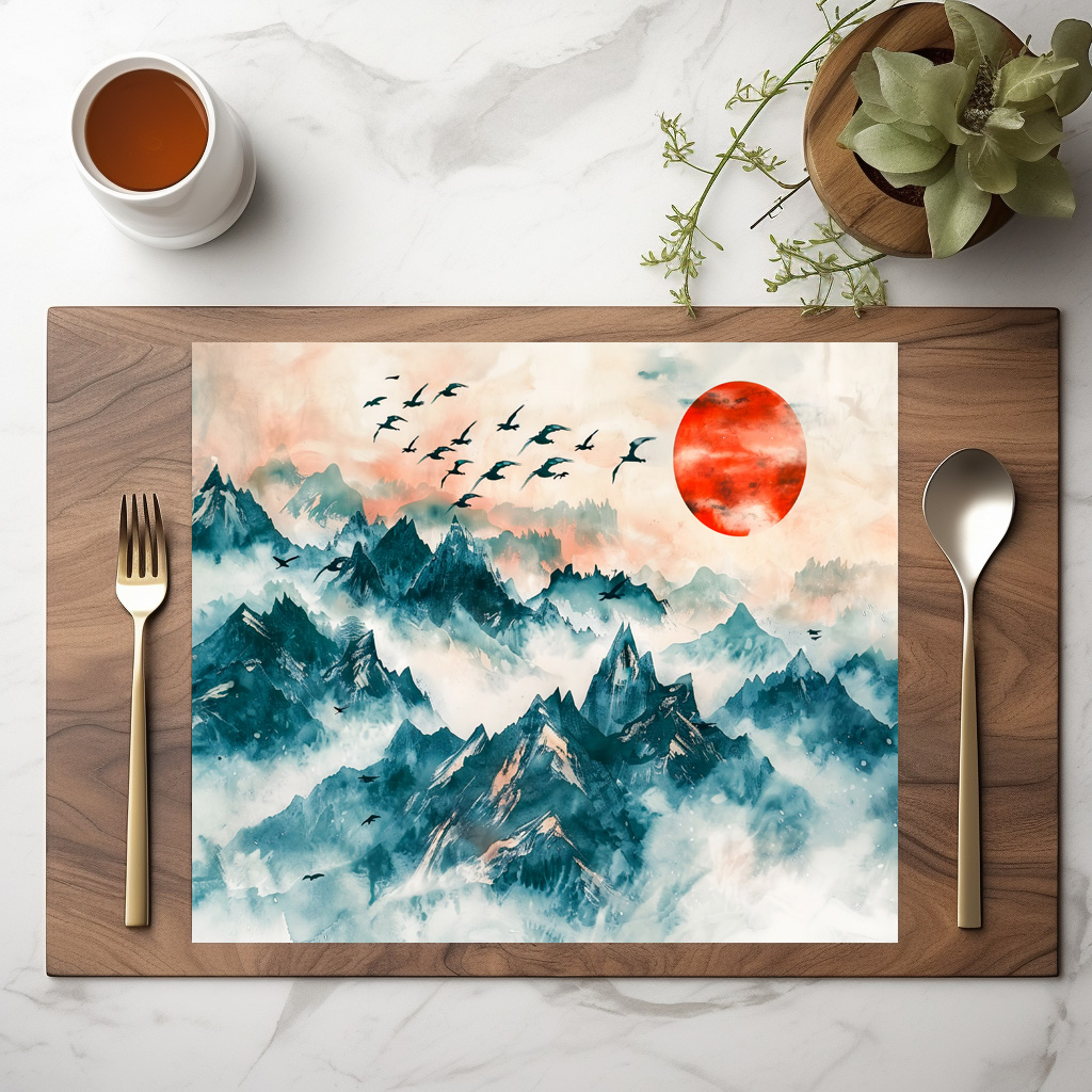 "Chinese Watercolor Birds Soaring over Mountains" by Anja Frost