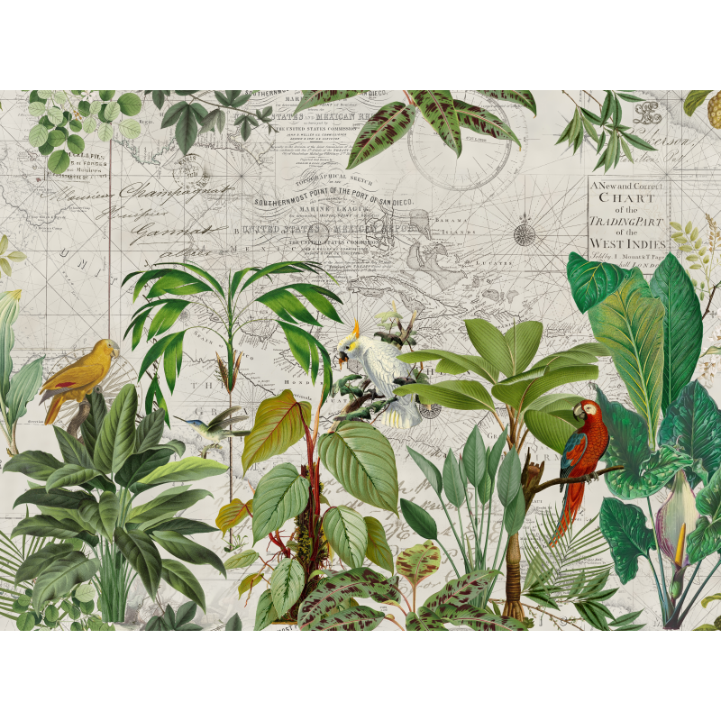 Tropical birds and exotic vegetation jungle illustration across old map of West Indies. Perfect for nature lovers, travelers and adventurers who love the urban jungle style