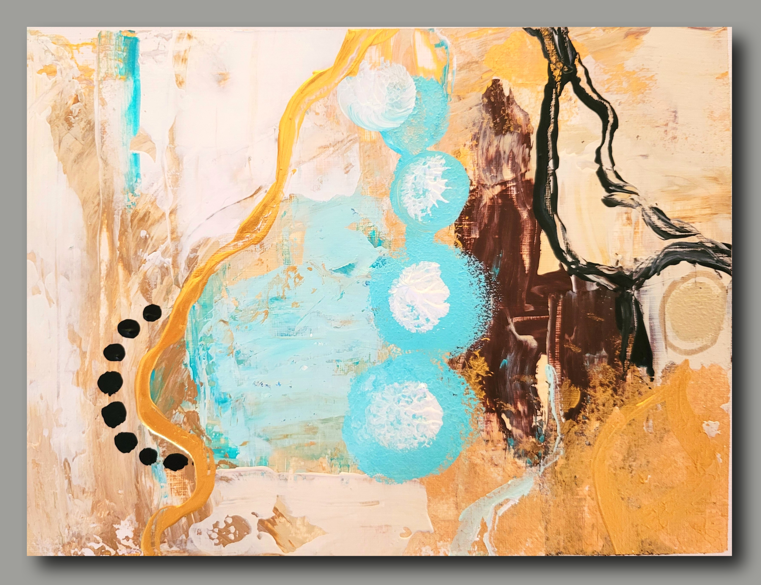 Das abstrakte Kunstwerk in Gold, Türkis und Sandfarben strahlt moderne, zeitlose Eleganz aus. Die sanften, ineinanderfließenden Farbtöne erzeugen eine harmonische Balance, die den Betrachter in eine angenehme Ruhe versetzt. Die schimmernden Goldakzente verleihen dem Werk eine luxuriöse Note, während Türkis und Sand eine beruhigende, erdige Tiefe hinzufügen. Ein wahrhaft inspirierendes Meisterwerk zeitgenössischer Kunst.